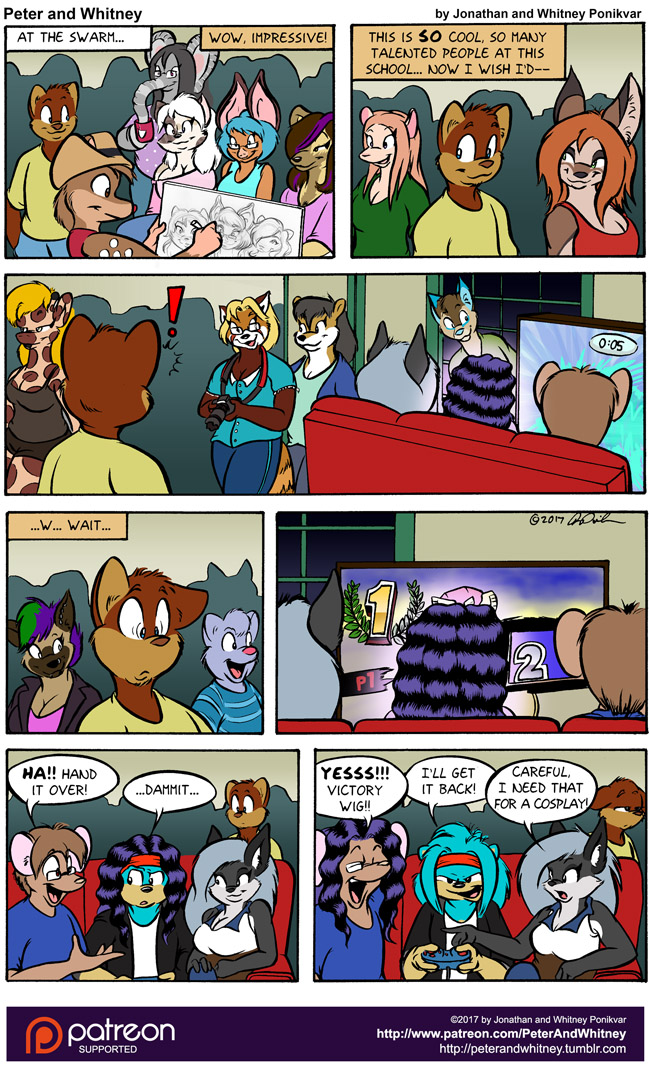 The Summer Swarm was the first event I went to during my first weekend at SCAD. The exact scene in the first panel was one of my first exposures to other students' artwork at the school, and it blew me away to see so many talented people in one place. It really was an amazing experience, since everyone was so like-minded and legitimately interested in meeting other artists. It was a great time to just bring a sketchbook and have some fun which is what Peter is wishing he had brought with him in the second panel, before his dialog is interrupted.