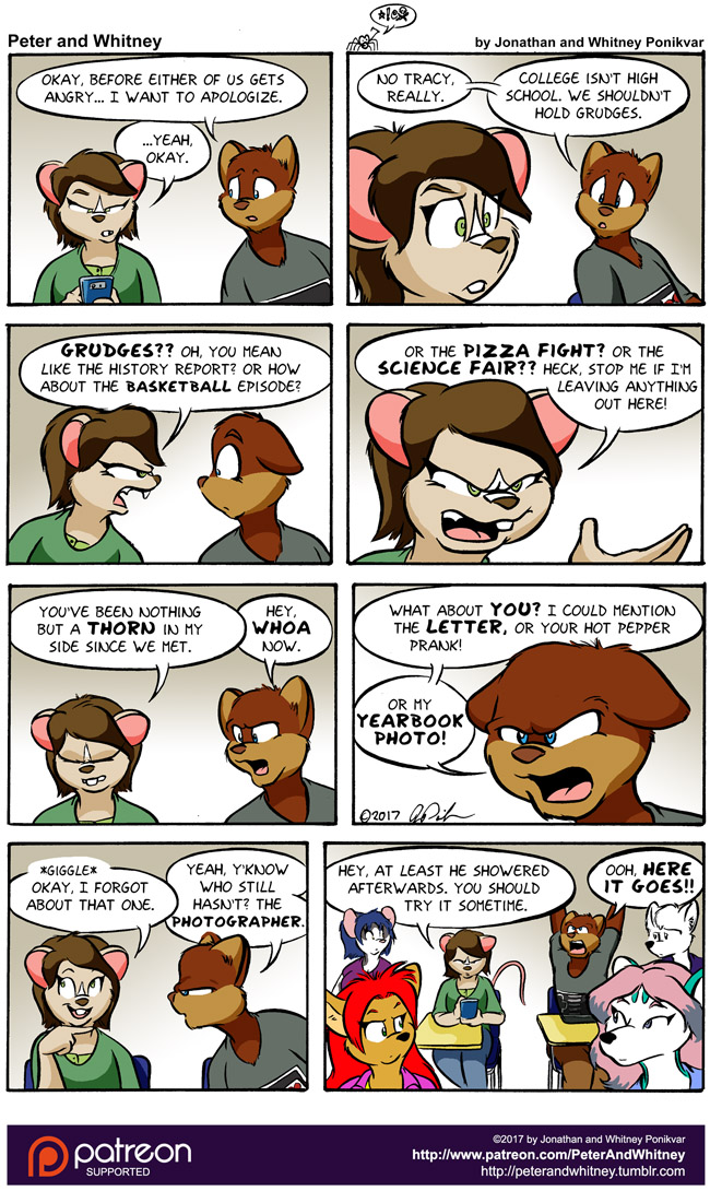 Also, speaking of Tracy's character, I feel I should take this moment to clarify her inspiration. She is yet another design in the roster who is directly based on a real-life counterpart (and even modeled after her inspiration, how she looked during our early college years), but unlike the others, the cartoon Tracy's relationship to Peter is purely fictional. In reality she is one of our best friends, and in fact was Whitney's childhood friend all the way through elementary and high school. During a brainstorming session for Peter & Company a few years back, I wanted to have additional antagonists for Peter at school, so the idea was tossed to introduce Tracy to fill one of those roles (she thought it was hilarious and was honored to have the role of giving Peter a hard time, hehe). This portrayal is, again, entirely fictional, as we have never been enemies in any sense of the word; she is actually one of the sweetest and most talented individuals I've ever known.