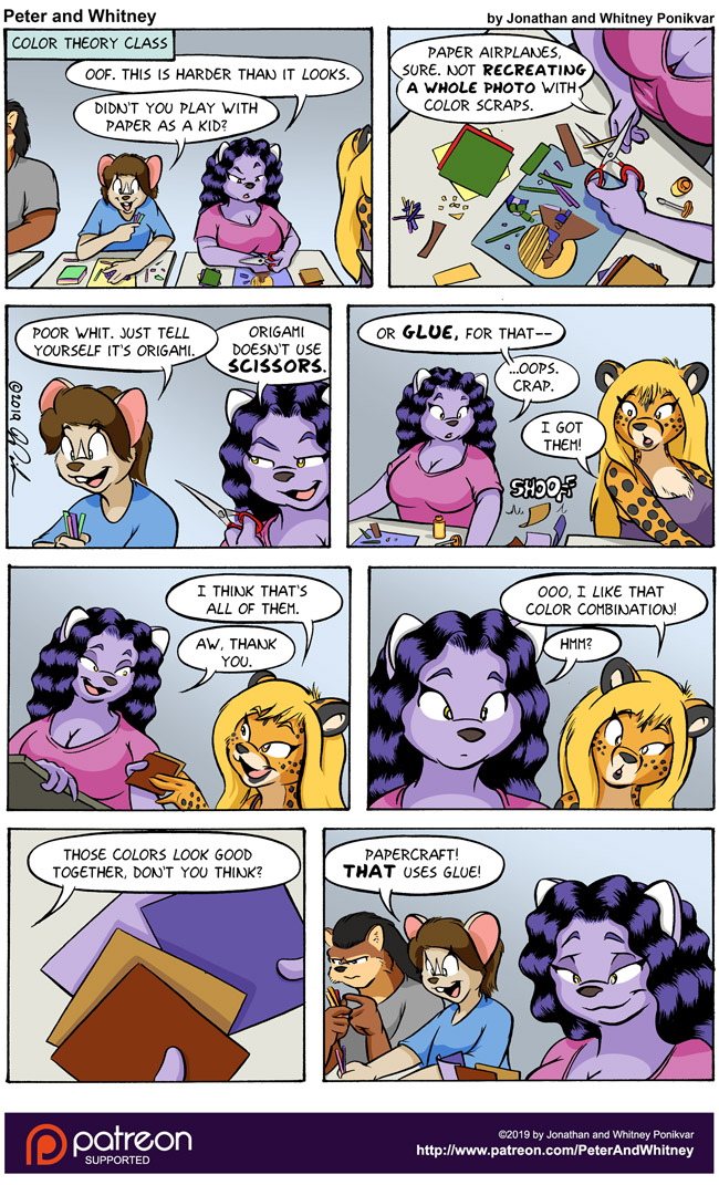 Color Theory class was mostly fun, but it had its share of tedious assignments. This one in particular I had to deal with during undergrad, and it required using an entire package of 4" square colored papers to cut various scraps and arrange them to match the colors in a photo.