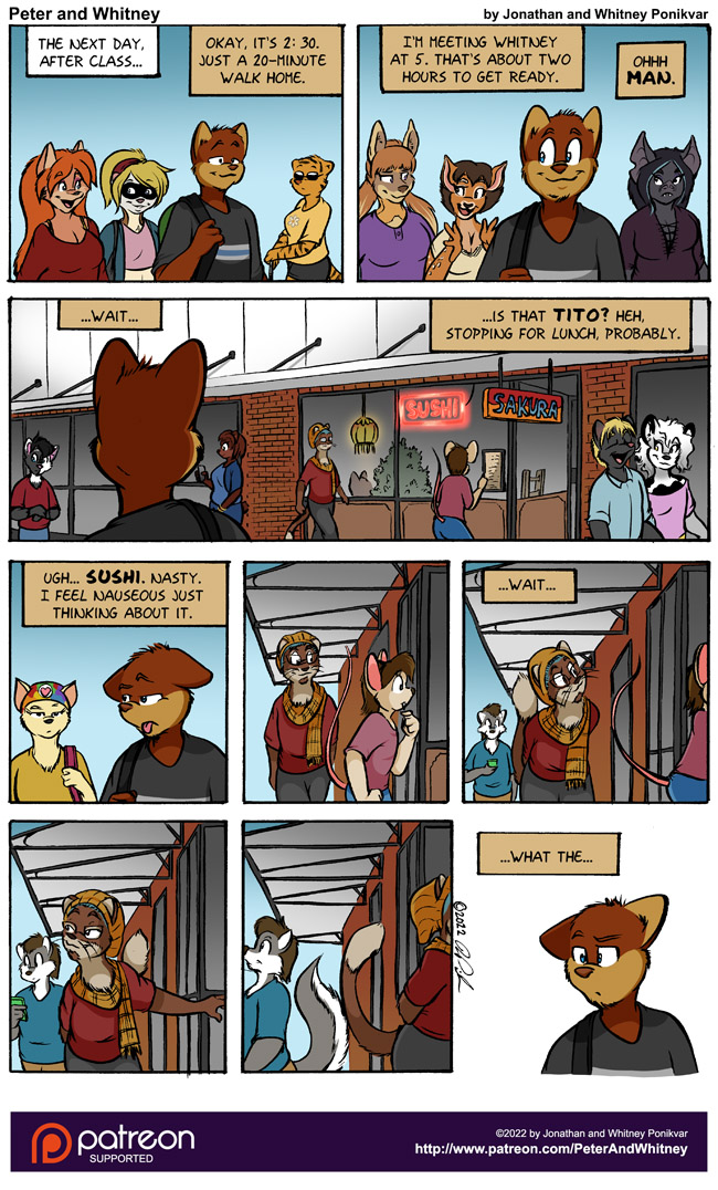 ANYWHO, thanks to the following folks from the Peterverse Discord for offering up their characters as cameos in this page: Seekyr | Not a Number | CR Wolf | ZoroarktheKitsune | Askdwayneelliot | Threyon | PaulToon1990 | Da Floofy | Tamara | MalyDude | Kelchan | The Libromancer 2022. Would you like to have your character appear in a future page of P&C or P&W? Join our Discord today!